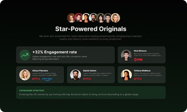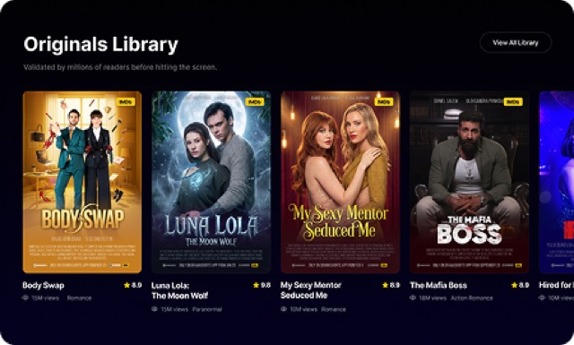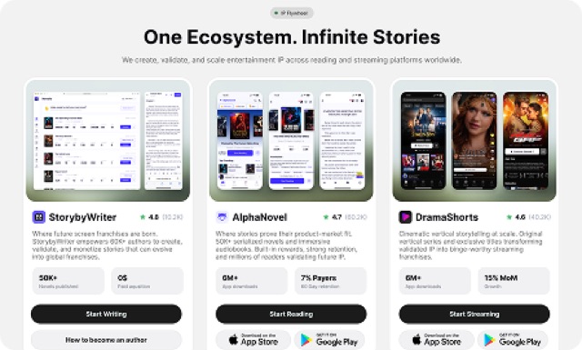 Cinematic vertical streaming with original series and exclusive titles — transforming validated IP into binge-worthy franchises. 6M+ downloads, 15% MoM growth.